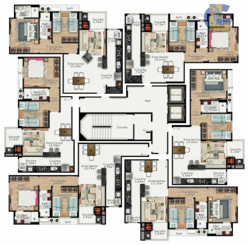 - Piso porcelanato e laminado nas áreas íntimas
